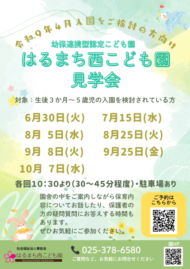 令和7年7月から10月にかけて、お子様の入園をご検討の方向けの園舎見学会を行います。